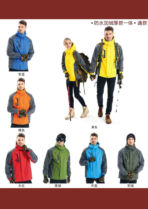沖鋒衣,外文名Jackets,又名Outdoor Jackets,音譯為夾克,戶外運動必備裝備之一。沖鋒衣之所以能成為所有戶外愛好者的首選外衣,是由其全天候的功能決定的。沖鋒衣的 英語為“Jackets”或者“Outdoor Jackets”,直譯過來就是“夾克”,沖鋒衣并不神秘,就是夾克衫,但由于這種功能性服飾從國外傳到中國時,國人為了和普通衣服區別開來,就從其“意譯”上入手,叫做“沖鋒衣”。越來越多的企業把這一種服裝當做職業服裝來使用,比如經常在戶外工作的人們。在服裝的后背或前胸印繡上本企業的LOGO或標識這樣就具備了宣傳及展示企業形象的效果。